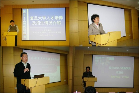 复旦大学校长助理、招生办主任丁光宏教授代表复旦大学致欢迎辞,并做了“复旦大学人才培养理念及招生情况介绍”。复旦大学上海医学院副院长汪玲教授代表上海医学院致欢迎辞,并介绍了复旦大学上海医学院的基本概况、人才培养理念及2013年开始的医学分代码招生工作。基础医学院院长汤其群教授代表学院致欢迎辞并介绍了基础医学院。