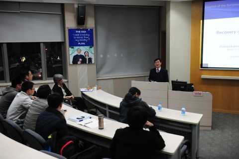 讲座开始后,Melander 处长首先带领同学们简单回顾了欧债危机的演变历程,并指出由于中欧之间存在着密切的经贸关系,欧债危机的演进一直备受中国的关注。而为了应对危机,欧盟自危机爆发以后也采取了一系列的应对措施,比如克服金融市场碎片化、财政整顿、结构重组以及建立银行业联盟等。这些措施的实施取得了一定的成果,各国国际收支的差额逐步缩小,并促进了经济增长。而公众对于金融市场的信心首先得到恢复。