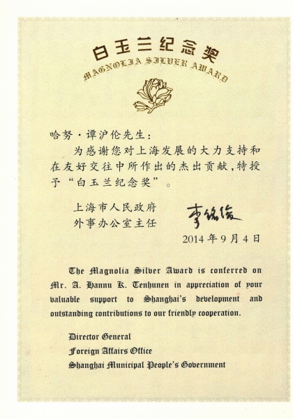 2014年上海市“白玉兰纪念奖”于今年9月初揭晓,来自22个国家的50位外籍友人获得了今年的“白玉兰纪念奖”。我校推荐的芬兰籍顾问教授哈努•谭沪伦(A. Hannu K. Tenhunen)荣膺此奖。