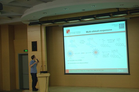 会上,来自汉堡大学代表团成员Sven Petersen就多功能响应性聚合物材料作了介绍,解析了光敏、温敏性,PH响应性聚合物的研究现状等,并与现场同学进行了互动。随后,来自汉堡大学的Doris Wong, Mohammad Vakili, Fenjia Moldenhauer, Daniel Griebe等人也纷纷展示了自己的研究成果。同学们提出了一系列自己感兴趣的问题,与台上各位报告人进行热烈的交流与讨论,现场学术探讨的气氛浓厚而热烈。