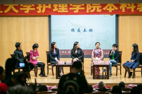随后的校友互动环节中,1986级校友(现任美国Cedars-Sinai医学中心血透团队主任)朱青、1988级校友(曾担任强生公司市场部总监,美纳里尼(中国)投资有限公司市场部经理)杨建东、2000级校友(现任拉萨市第二人民医院手术室护士长,自治区抗震救灾先进个人)尼玛玉珍、2001级校友(现任东南大学哲学与科学系副系主任,副教授)尹洁和2004级校友(现任华东医院日间手术病房护士长)夏露作为校友代表分享了她们与母校之间的故事。