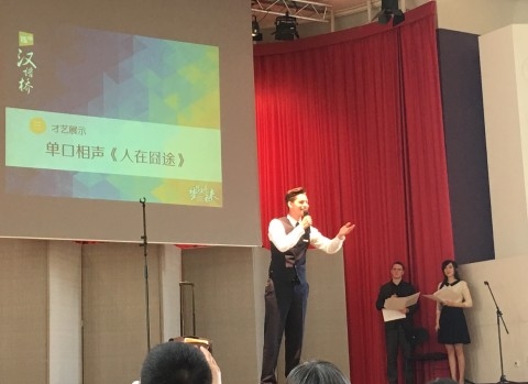 才艺表演环节,费立志带来单口相声,与观众互动,模拟飞机上配餐送茶服务。“先生,请问您想喝点儿什么?”他走下舞台,问嘉宾——中国驻德国大使馆教育处公使衔参赞董琦教授,“啤酒”,董公参现场发出考题。“好的,给您德国啤酒,请慢用”费立志同学从容的应变能力赢得观众掌声。