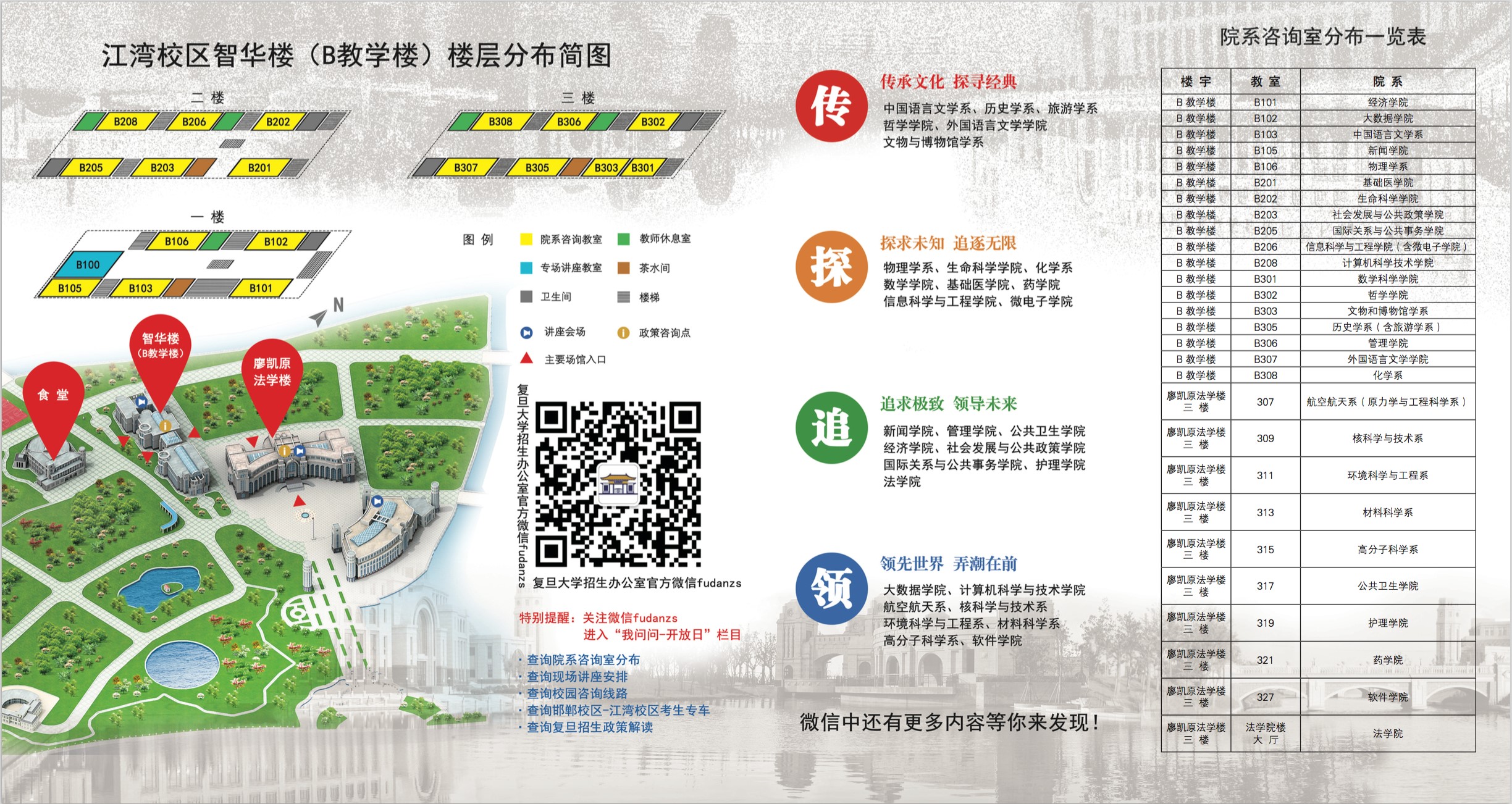 活动期间,欢迎考生和家长关注招办官方微信 fudanzs,可自助查询关于开放日活动的各种公告和说明。