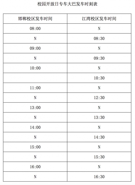 温馨提示:请考生和家长乘坐公共交通工具来访。开放日当天,为方便考生和家长前往江湾校区,邯郸校区与江湾校区之间将安排往返专车大巴一辆,每一小时发车一班。