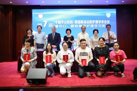 日前,第七届“中国华山医院-美国麻省总院护理国际论坛暨伤口、静脉输液护理学习班”在复旦大学附属华山医院举行。华山医院副院长马昕主持开幕式。上海市卫计委科教处处长张勘、医政医管处副处长吴宏、上海市护理学会第十届理事长翁素贞以及华山医院副院长邵建华出席论坛并致辞。美国麻省总院(MGH)护理部副主任Kevin Bruce Whitney带来了4000多位护理同行的问候。全国各大医院护理管理者、临床护理专家和华山医院护理人员200余人参会。