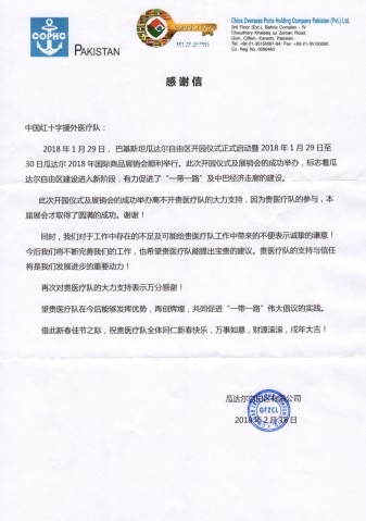2月26日,附属华山医院援瓜达尔港医疗队队长吴钢从中国港控瓜达尔自由区有限公司副总经理胡耀宗手中接过一封感谢信,信中对医疗队在瓜达尔自由区开园仪式中出色的医疗保障和大力支持表示肯定和感谢。