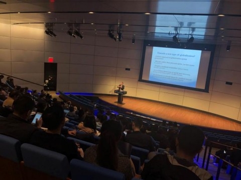 张维为教授在题为《中国模式及其对全球治理的启示》的主旨演讲中表示,改革开发以来的数十年,中国的表现强于其他亚洲国家总和,背后是中国模式的成功。他对中美两国在经济表现、中位家庭净资产水平、民调中对两国人民对未来预期等进行了比较,以详实数据对比两国的整体发展,阐明中国模式的生命力与比较优势。他围绕“中国模式的历史背景”、“中国崛起和未来发展”、“中国贡献和全球治理”三个主题,解释了中国的政治、经济和社会模式,详解了中国政党制度的逻辑、选贤任能与协商民主的特征。他指出,中国模式取得了一系列成功,这包括中国有一个代表人民整体利益的政治力量;政府作用与市场作用较好的结合;中国历史上未发生过欧洲历史上那种宗教战争、贸易热战、种族战争等等。他强调,中国道路为全球治理提出了新的哲学逻辑与操作方法。他以中国的“一带一路”倡议为例,详细阐述了合作共赢思路下的新型全球化和全球治理民主化、以中国的互联网革命为例阐述了民本主义导向的施政理念。张维为教授还就2018年的修宪、中国互联网治理、“一带一路”的意义、中国90后一代的发展机遇等问题与现场观众进行了互动解答。