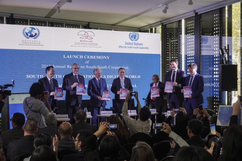 乌拉圭东岸共和国总统Tabaré Vázquez、南南合作金融中心主席蔡鄂生、中国国务院扶贫开发领导小组办公室洪天云副主任、印度尼西亚共和国国家发展计划部政治、法律、国防和安全部副部长Slamet Soedarsono、挪威外交部国务秘书Jens Frølich Holte出席报告发布仪式并致辞。乌拉圭总统Tabaré Vázquez指出“世界正在经历技术变革的洪流,改变着发展模式,迄今为止,我们所构想的经济有一个新的学科:数字经济,它正在突飞猛进地发展。如果我们仔细观察2011年到2017年的大数据市场,它已经增长了五倍,估计在未来10年中,它将会是现在的三倍。大量可用数据、处理和传输数据的能力,为发展带来了广泛的机遇。然而,挑战在于,这些变化如何使地球上最大数量的居民受益,并惠及全体人民,为最贫穷者服务。”联合国南南合作办公室主任Jorge Chediek指出,“历史上,南方国家是技术的接受者,但数字技术不仅是北方国家产生的,也有很多来源于南方国家,这些国家正在创造新的技术,并开发出新的模式,在这种背景下,南南合作对于其他发展中国家学习和利用这些新工具变得非常重要”。蔡鄂生主席指出,希望推动数字技术领域的南南合作,提振发展中国家迎合新技术变革的信心。