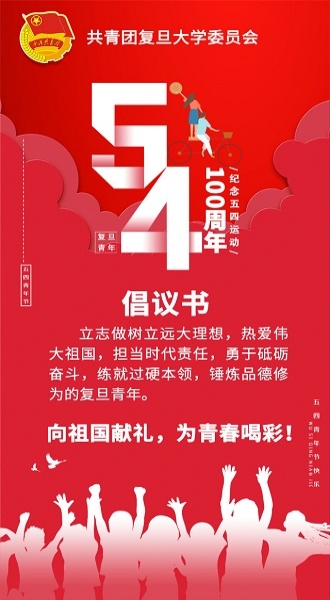 “立志做树立远大理想,热爱伟大祖国,担当时代责任,勇于砥砺奋斗,练就过硬本领,锤炼品德修为的复旦青年!” 活动现场,复旦共青团向全校青年发出倡议,响应习近平总书记对新时代青年提出的期望,呼吁青年人要以永久奋斗的姿态,继续发扬五四精神,以实现中华民族伟大复兴为己任,不辜负党的期望、人民期待、民族重托,不辜负这个伟大时代!