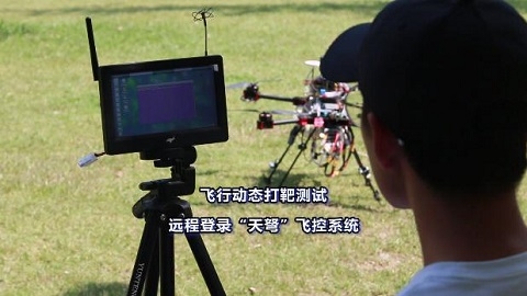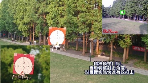 “天弩”察打一体四旋翼无人机系统,集识别、跟踪、打击功能于一体,设计用于空飘物、低慢小飞行器管制。 “天弩”系统设计组成主要分为三部分:目标识别与处理系统、全方位避障系统、底层飞控系统。各分系统协同运行,实时通讯,共同构建完整功能体系。以复杂环境为背景,构建小目标自主识别与跟踪技术。设计了鲁棒性好、可靠性高的目标自主识别与高速跟踪算法。发射装置采用连发火力覆盖设计思想,每秒10次自动校正射击弹道,对目标实施快速有效打击。同时构建以模糊控制为核心的无人机实时避障解决方案,保障飞行安全。