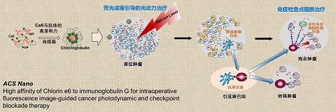 近日,复旦大学药学院陆伟课题组利用“搭便车”的方法设计了一种新型诊疗一体化制剂,发展了术中荧光影像引导的光动力联合免疫检查点阻断治疗癌症的新治疗方法,相关成果以“High affinity of Chlorin e6 to immunoglobulin G for intraoperative fluorescence image-guided cancer photodynamic and checkpoint blockade therapy”为题,在线发表于国际知名学术期刊ACS Nano(IF 13.903)。