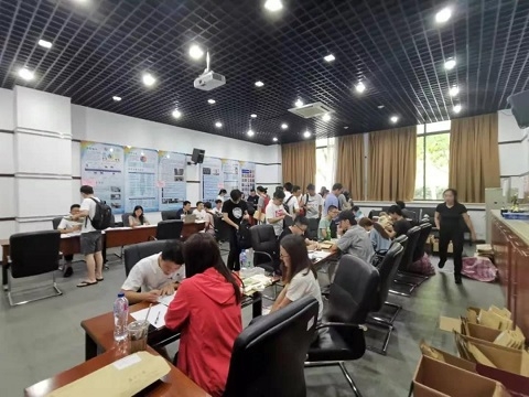 研究生院与物业提前布置场地,调好大厅空调,使新生能在舒适的环境下完成报到;早上八点正式开始报到前,各部门、院系提前布置场地,设置多种指引标识,准备新生材料,保安大叔帮忙搬运沉重材料。