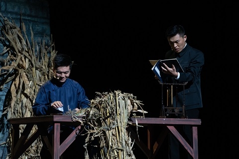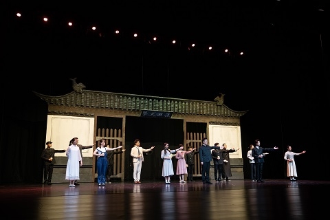 《陈望道》大师剧从陈望道青年时留学日本的初心切入,回顾了陈望道在日系统学习马克思主义后回国从事教育和革命事业,始终追求真理,教育报国的伟大一生。该剧从去年的七幕浓缩为三幕,整个剧情的主题显得更加聚焦而富有节奏感。导演刘宜林介绍说,《陈望道》大师剧的整体编排以写意为主,力求展现望老的一生经历、道德文章和人格魅力。作为导演,编排这部剧也让他深受教育和感动。1919年,陈望道毕业回国后受聘浙江一师,与进步师生一起积极投身五四新文化运动。舞台上生动呈现出陈望道先生1920年春在义乌老家柴房翻译《共产党宣言》全文的场景,“真理的味道”让台下年轻的观众为之动容。1920年,陈望道来到复旦大学任教。在此期间,他大力推广普通话,并开设文法、修辞等多门课程,延续新文化思想。1952年,陈望道出任复旦大学校长。在后来的院系调整中,陈望道先生更是奔走四方,在院系调整、学科建设、校园规划、师生待遇等各方面都倾注心血,为复旦的发展作出了重要的贡献。大事件与小故事共同构成的叙事链让望老这位大师立体而亲切地呈现在师生眼前,给零零后的新生们带来生动一课。雷鸣般的掌声既是对演出的肯定,也是对大师的致敬。