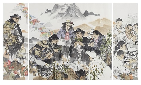 雪域高原上彩旗飘扬,山脚下的藏菠萝花旁是一个个凝神辨析植物的脸庞……这幅长3.59米、高1.98米的巨型国画,讲述着钟扬教授带领学生在西藏雪山上采集植物种子的故事。今年六月,复旦大学基建处教师蔡志华邀请上海著名中国画、人物画画家张渭人,共同创作了这幅致敬“种子科学家”钟扬教授的国画作品。秋风又起,这幅作品为钟扬教授逝世两周年献上一份纪念。