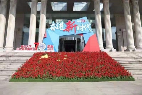 光华楼台阶前,鲜红的花朵和金黄的五角星组成了一面巨幅五星红旗。展览入口处,“壮丽70年 奋进新时代”几个大字赫然在目,“复旦大学庆祝新中国成立70周年主题展”的标语引得路过的师生纷纷驻足留影。