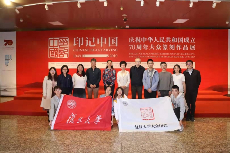 在庆祝中华人民共和国成立70周年之际,为更好地推进复旦大学“三全育人”综合改革试点,进一步推动艺术教育与德育相结合,大力弘扬中华优秀传统文化教育,10月8日,校党委书记焦扬率领复旦师生代表前往北京中华世纪坛艺术馆,参观“印记中国(1949-2019)——庆祝中华人民共和国成立70周年大众篆刻作品展览”。校党委副书记尹冬梅共同参观展览。