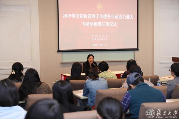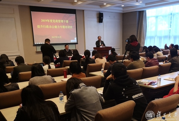 2019年11月29日下午,复旦大学2019年度党政管理干部提升行政办公能力专题培训班在光华楼东主楼101报告厅举行结业仪式。来自各院系、所、中心和机关部处的59位综合办主任及部分部门公文管理员顺利完成了包括主题报告、团体训练、实务操作、交流讨论等24学分的课程培训。