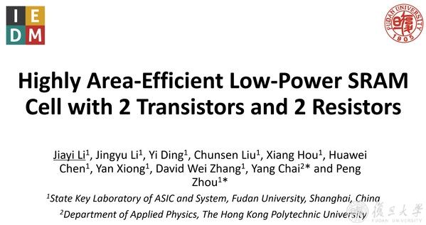 在12月10日举行的第65届国际电子器件大会(IEDM,International Electron Device Meeting)上,复旦大学微电子学院硕士生李家意作为第一作者宣读了论文《2晶体管2负载组成的高面积效率低功耗静态存储器》(“Highly Area-Efficient Low-Power SRAM Cell with 2 Transistors and 2 Resistors”),介绍了在复旦完成并验证的目前世界上组成单元最少的静态随机存储器(SRAM,Static random access memory)。
