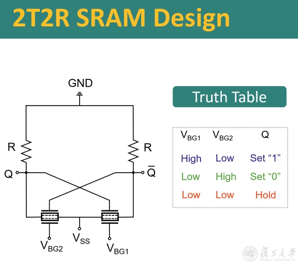 SRAM一般应用于先进计算的高速缓存中,但由于需要6个晶体管(或4个晶体管加2个负载)才能实现基本功能,集成度低,功耗大,限制了应用前景。微电子学院周鹏教授课题组与香港理工大学柴杨教授课题组合作,在前期提出的原始创新双表面沟道晶体管的基础上(Nature Nanotechnology,14,662,2019),充分发挥原子晶体本征优势,利用2个晶体管、2个负载电阻实现了完整功能的SRAM器件,在同等技术节点下可节省晶圆面积33%并远远低于目前不同器件功耗。同时,由于该器件实现了独立的读、写操作,可以促进SRAM在存内计算的创新应用,提供存算一体的新路径。