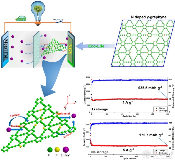 崔晓莉课题组、王松有课题组从实验和理论上研究了一类新型高比容量碱金属二次电池材料——氮掺杂石墨单炔。实验证明,氮掺杂γ-石墨单炔表现出优异的储锂和储钠容量以及高倍率性能,并从理论上解释了锂(或钠)的充放电机制。