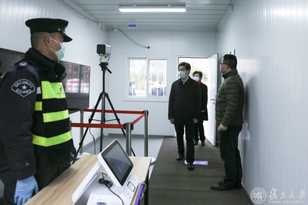 在邯郸路220号复旦大学正门,廖国勋检查学校使用红外体温检测系统和门岗查验证件、严格校门管理情况。