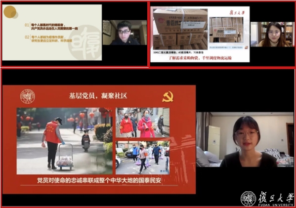 当天,一场主题党日活动在线上进行。复旦大学在鄂研究生第四临时党支部的党员们正在观看学校制作的《复旦力量》MV。廖国勋一行在智库楼通过视频看到片中张文宏、钟鸣等复旦党员冲锋在前线,复旦医务工作者火线入党的画面令人动容。围绕“在大战中践行初心使命”这一主题,支部党员们讲述着身边的战“疫”故事,分享所思所感。正在湖北黄冈的哲学学院博士生王韵婷分享了自己与同学募集抗疫物资捐赠给抗疫一线的故事,她说:“我们所做的事情可能微不足道,但是却是我们作为党员的一份义不容辞的责任。”计算机科学技术学院硕士生水泽农讲述了同学们参与科研攻关,用 AI技术助力新冠肺炎影像诊断,以及参与开发口罩预约配售信息管理系统,帮助实现覆盖全市居民的口罩配售的故事。他说:“每个人都是时代的铸就者,共产党员永远走在人民需要的第一线。”