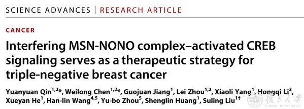 近日,《科学》(Science)子刊《科学进展》(Science Advances)杂志在线发表了复旦大学生物医学研究院院/复旦大学附属肿瘤医院柳素玲团队题为“Interfering MSN-NONO complex-activated CREB signaling as a therapeutic strategy for triple-negative breast cancer”的研究论文。该论文揭示了三阴性乳腺癌特异性高表达的MSN可以通过与核蛋白NONO相互作用促进激酶PKCζ的核定位,从而磷酸化CREB并激活了其下游信号通路,为基于MSN和下游信号通路开发新的针对三阴性乳腺癌的治疗方法提供了有力证据。