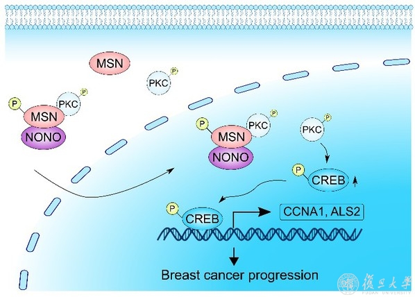 该研究表明磷酸化的MSN及其激酶PKCζ在核蛋白NONO的帮助下进入细胞核。pPKCζ的核定位上升使得CREB磷酸化,从而CREB信号通路被激活,增强了含有cAMP响应元件的相关基因的表达如ALS2及CCNA1,最终促进乳腺癌的进展。