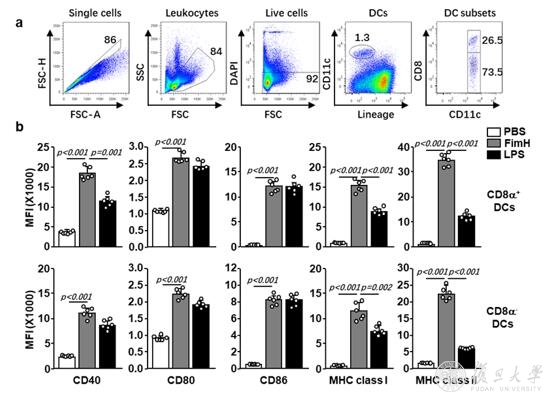 研究团队借助大肠杆菌pET28a表达纯化了FimH蛋白,并分别在小鼠体内和人外周血细胞中证明FimH处理可有效诱导相应DCs亚群的活化,并通过增强Th1和Tc1细胞发挥作用。同时,通过利用基因敲除小鼠证明FimH对DCs的活化依赖于TLR4但不依赖于髓样分化蛋白2(MD2)。