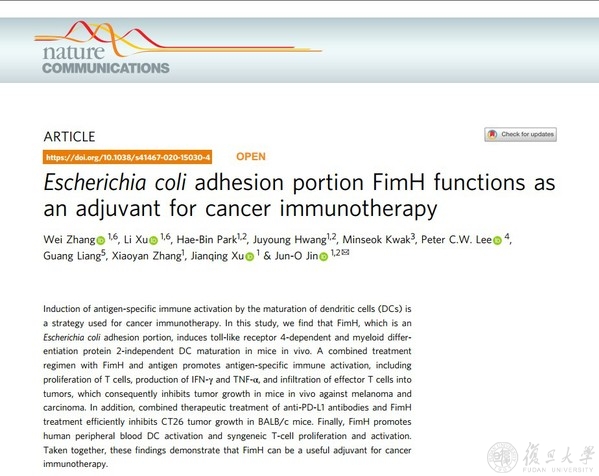 近日,复旦大学生物医学研究院教授张晓燕和上海市(复旦大学附属)公共卫生临床中心兼职教授Jun-O Jin团队在小鼠体内和人外周血细胞中共同揭示大肠杆菌粘附素FimH在癌症免疫治疗中的佐剂效应,为癌症免疫治疗佐剂提供新的候选。相关研究以“Escherichia coli adhesion portion FimH functions as an adjuvant for cancer immunotherapy”为题在线发表于《自然·通讯》(Nature Communications)。