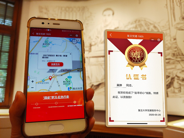 打开“复旦党建·1925”微信小程序,全国党建工作标杆院系物理学系党委书记吴骅在“定向活动”模块看到了一条个性定制的红色行走路线。路线显示以《共产党宣言》展示馆为起点,途径中共一大会址纪念馆,最终在中共二大会址纪念馆完成行走。在相应场馆完成线下学习后,党员们点击“我要签到”,即在线上成功打卡。完成路线上的所有打卡后,一张专属的认证书自动生成。