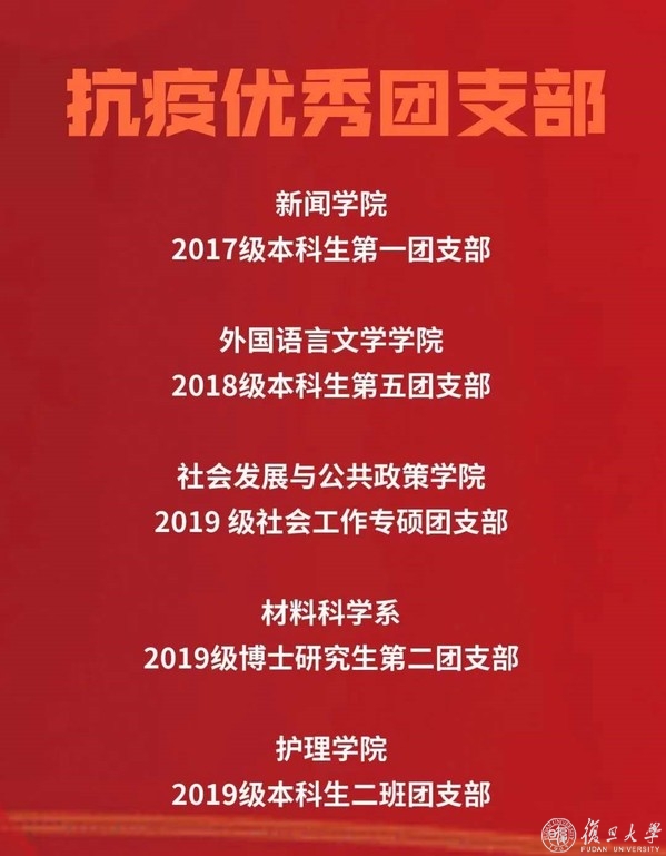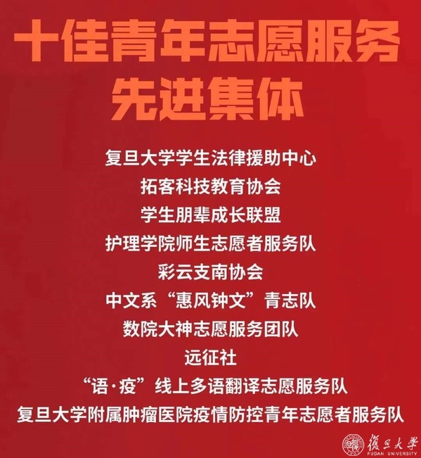 为弘扬复旦大学青年志愿者精神,展示优秀志愿者风采,进一步激励广大志愿者积极投身志愿服务事业,日前,复旦大学团委面向全校师生开展了2020年十佳青年志愿服务先进集体、抗击疫情优秀团支部评选工作。本次活动共评选出10个青年志愿服务先进集体和5个抗疫优秀团支部,复旦大学学生法律援助中心等10个青年志愿者服务队获评十佳青年志愿服务先进集体,复旦大学新闻学院2017级本科生第一团支部等5个团支部获评抗疫优秀团支部。这些优秀集体,各自以独特的方式在疫情期间发光发热,服务社会,为抗击疫情贡献了一份力量。