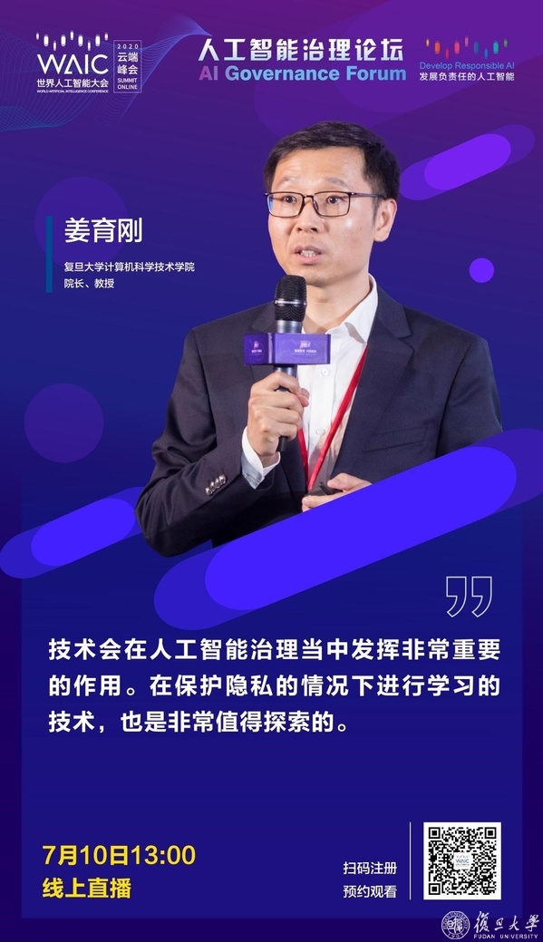 为积极落实国家人工智能治理原则,进一步构建人工智能治理国际交流平台和全球合作机制,在科技部战略规划司和上海市科委的指导下,由复旦大学计算机科学技术学院联合承办的2020世界人工智能大会人工智能治理论坛于7月10日下午举行。本届人工智能治理论坛以“发展负责任的人工智能”为主题,探讨“技术+制度”双轮驱动的治理综合解决方案,探寻人工智能治理新模式,推动人工智能治理原则落地落实。