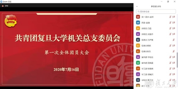 7月16日,共青团复旦大学机关总支部委员会第一次全体团员大会在线上召开,选举产生了机关团总支第一届委员会。机关党委常务副书记张骏楠、校团委书记赵强、机关党委副书记黄芳出席大会,会议由黄芳主持。来自学校机关各部处的54名团员出席大会。