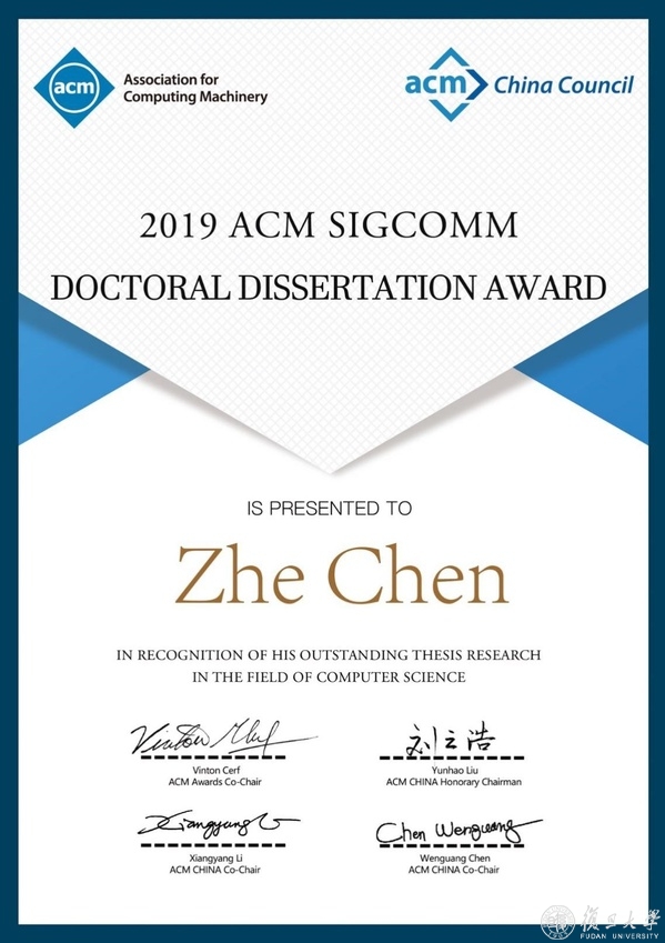 为表彰和激励全国范围内计算机网络领域的博士研究生潜心钻研,做出优秀的科研成果,完成高水平的博士论文, ACM中国理事会授权设立ACM SIGCOMM China优秀博士论文奖,授予在计算机网络和通信系统相关领域内的基础理论或应用基础研究方面有重要突破,或在关键技术和应用技术方面有重要创新的全国范围内计算机领域博士论文的作者,每年在全国范围内评选出不超过3名在计算机网络领域获得突出科研成果的博士毕业生为获奖者。