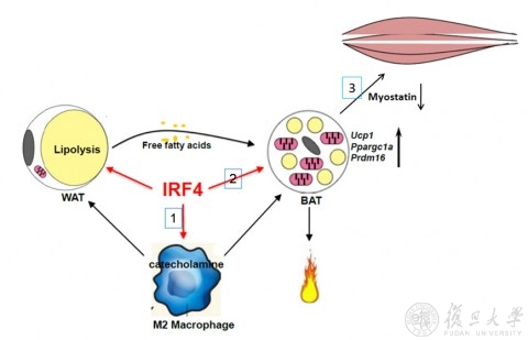 干扰素调节因子4(Interferon regulatory factor 4,IRF4)是一种分子量为52kD的转录因子蛋白,具有重要的免疫调节作用。自哈佛大学教授Evan Rosen创新性指出IRF4是脂肪细胞发育和脂类分解中的关键因子后,加州大学洛杉矶分校(UCLA)教授孔星星进一步发现IRF4在棕色脂肪的热量生成、能量消耗和低温耐受中发挥重要作用,为IRF4的代谢调控分子机制开辟了更为开阔的研究思路。已有研究发现,白色脂肪组织(WAT)中的IRF4可通过调节巨噬细胞M1/M2极化调控肥胖引起的炎症;棕色脂肪组织中(BAT)的IRF4能与PGC-1α直接相互作用、促进UCP1的表达和热量生成,此外,还通过分泌蛋白Myostatin调控骨骼肌功能(如图1所示)。