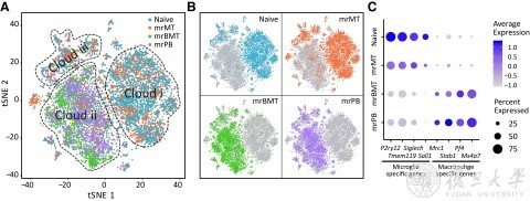 然而,mrBMT和mrPB细胞更多地保留有外周巨噬细胞的特征,与CNS的小胶质细胞存在一定差异。此外,在某些特定的情况下,需要替换特定脑区的小胶质细胞,而不影响其他脑区。于是,课题组进一步开发了第三种方案mrMT(microglia replacement by microglia transplantation)。该方案可将外源小胶质细胞高效替换特定局部脑区的原生小胶质细胞,同时移植的细胞保留CNS小胶质细胞的特征。
