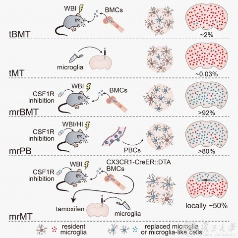 彭勃课题组开发了三种不同的小胶质细胞替换方案。课题组利用药物特异性抑制集落刺激因子1受体(CSF1R),高效清除CNS内的小胶质细胞,同时不引起副作用。随后,再进行骨髓移植。外源性的骨髓细胞可进入脑内并分化成小胶质细胞样细胞,替换效率超92%。同样,几乎所有的视网膜和脊髓的小胶质细胞被外源性细胞所替换。该方案命名为mrBMT(microglia replacement by bone marrow transplantation)。