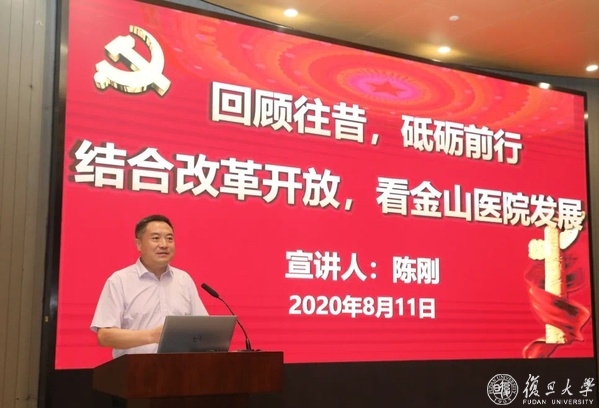 陈刚带领大家回顾了改革开放史,并在此基础上回顾金山医院的历史,医院建设和发展是和中国特色社会主义发展历程紧密联系在一起的。从上海石化总厂职工医院,到1984年10月18日上海第一医学院附属金山医院挂牌,到1998年4月金山区人民政府、上海石化股份有限公司和上海医科大学三方共建附属金山医院,再到2012年2月6日医院整体搬迁这一重大院史节点,医院沐浴着改革开放的春风,走上了历史性、可持续性发展道路。