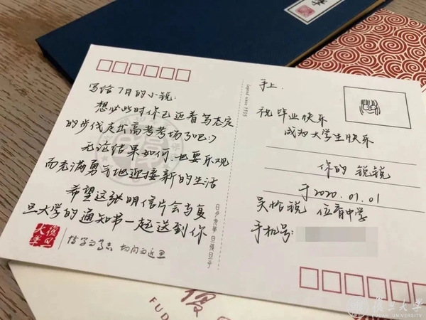2020年8月12日,当复旦大学录取通知书正在发往全国各地,邀请优秀学子进入百年复旦的璀璨星空时,复旦大学招生办公室潘伟杰主任带着特殊的“录取大礼包”,给四位学子带去了不一样的惊喜——和录取通知书一起到来的,还有八个月前他们亲手在复旦校园写下的“写给未来自己”明信片。
