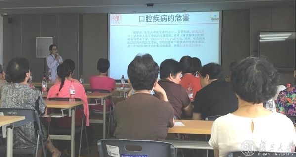 胡松玲首先以牙齿完好、牙齿缺损形成鲜明对比的几组图片作为切入点,引起老人们对口腔问题的重视和思考,接着介绍了常见的口腔问题形成的原因及形成,如龋齿(俗称“蛀牙”)、牙周炎、口臭等。她以通俗易懂的方式对口腔疾病的危害进行了专业解读。口腔疾病会引起胃肠超负荷工作,老年人的牙齿松动易脱落,影响食物的咀嚼和吞咽功能,增加胃的负担,引起各种胃病和肠道疾病;引发心脏疾病,牙周病患者心脏病的危害性要比牙龈健康者高出9倍;引发中风,引起牙周病的细菌可导致血管病变,促使体内血栓形成,因此容易引起中风;伤肺,口腔内的大量细菌会借助食物返流等被吸入气管进入肺部,导致肺炎;引发糖尿病,重度牙周炎是糖尿病患者血糖升高的危险因素之一。