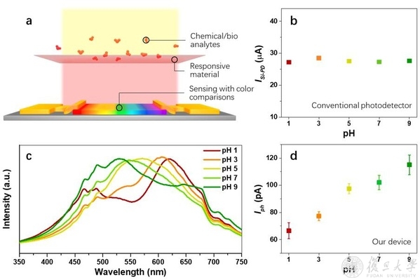图3. 基于带隙递变钙钛矿器件的化学/生物传感器结构示意图,及其对溶液pH值的探测功能展示