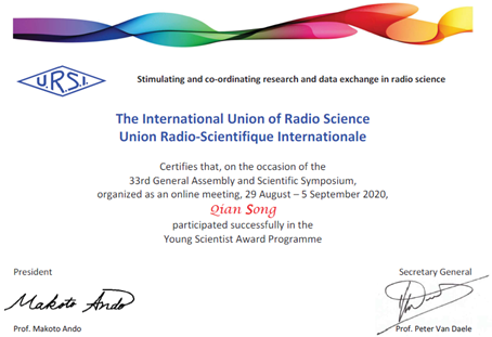 国际无线电科学联盟成立于1913年,是国际科学理事会下属的科学组织,负责促进和协调国际无线电相关领域的科学交流与合作,学术研究的讨论与传播,在国际无线电科学学界具有崇高的科学地位和社会影响。国际无线电科学联盟大会与科学研讨会(URSI GASS)是国际无线电科学联盟的三大旗舰会议之一,每三年举办一次,迄今已有近百年历史,今年由于新冠疫情于8月29日至9月5日在线举行。