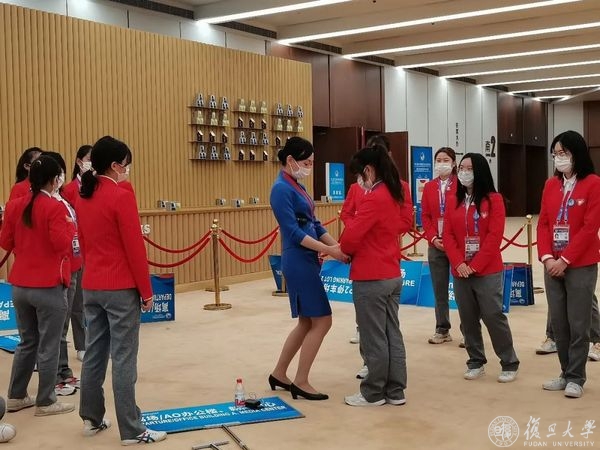 说实话,前期在场馆内花费了比我想象中多得多的时间。原本上午出发,晚饭前返回甚至还能赶上晚课,后来下班时间不断往后推,到岗时间也不断向前提,着实感受到了志愿工作的不易。前期很重要的一点是按照现场实际需求对志愿者的实际岗位作出调整,使得开幕式的岗位安排尽可能妥当合理,志愿者尽快适应身份;另外,为了更好地展现面貌,我们进行了两次礼仪课程,由十分有经验的空乘姐姐授课,专业地展示怎样完美站姿、标准体态,耐心地为每一位同学纠正动作,受益匪浅。甚至在休息的间隙大家也反复练习,力争拿出最好的精神面貌!