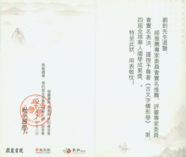 11月28日下午,由岳麓书院、凤凰网、敦和基金会联合主办的“致敬国学:第四届全球华人国学大典”在北京举行颁奖典礼,复旦大学出土文献与古文字研究中心教授刘钊所著《古文字构形学》荣获第四届全球华人国学成果奖。
