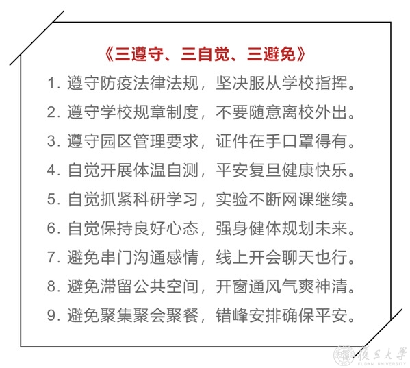 4月29日,在疫情防控逐渐常态化的背景下,复旦大学学生会联合研究生会,共同发布《疫情防控期间复旦大学在校学生行为规范倡议》,提出“三遵守、三自觉、三避免”,号召在校同学严格遵守防疫要求,携手战「疫」、共克时艰,守护校园平安。