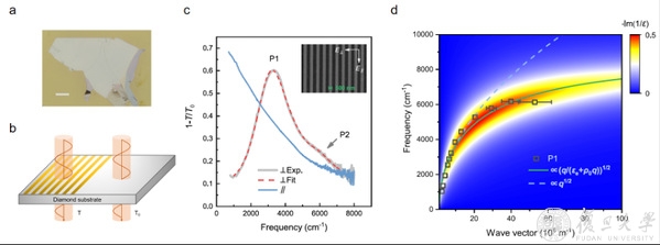 图:二硒化钽的(a)薄膜样品照片;(b)等离激元测量示意图;(c)等离激元共振光谱;(d)等离激元色散