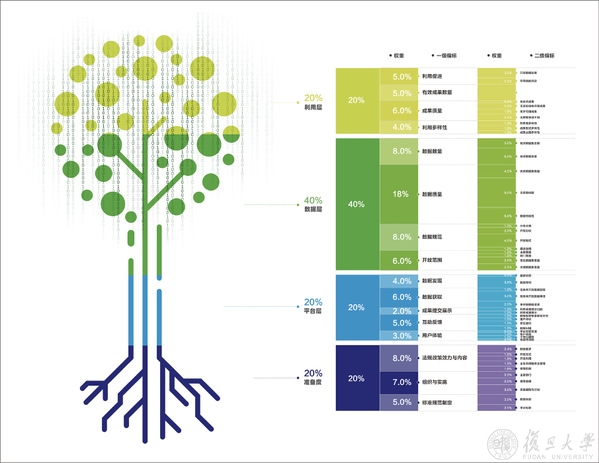“中国开放数林指数”从准备度、平台层、数据层、利用层四个一级维度及下属多级指标对地方政府的数据开放水平进行综合评价:准备度是“数根”,是数据开放的基础,包括法规政策效力与内容、组织与实施、标准规范制定等方面;平台层是“数干”,是数据开放的枢纽,包括数据发现、数据获取、成果提交展示、互动反馈、用户体验等等方面;数据层是“数叶”,是数据开放的核心,包括数据数量、数据质量、数据规范、开放范围等四个一级指标;利用层是“数果”,是数据开放的成效,包括利用促进、有效成果数量、成果质量、利用多样性等四个一级指标。