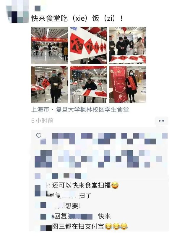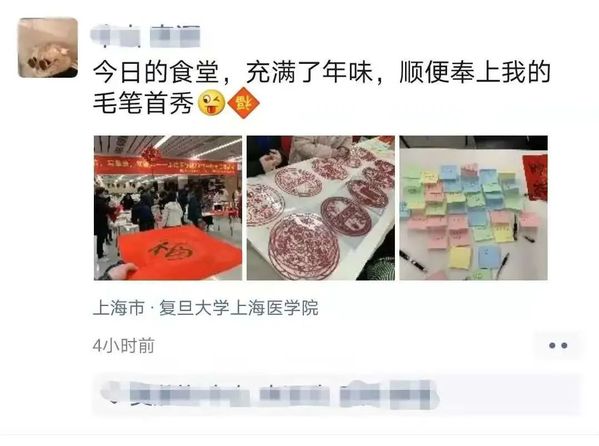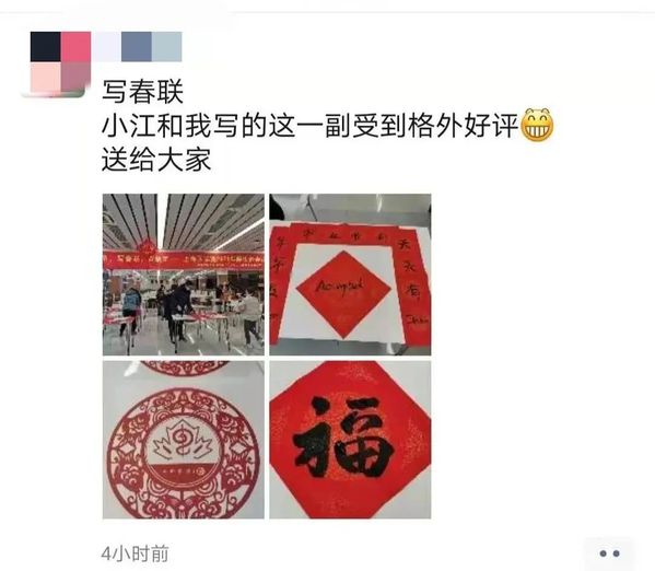 今天虽然没能真正参加线下的写春联活动,但看到现场活动的照片——留校同学们书写春联时的喜悦,热闹的氛围,让我感觉能参与组织这样为大家提供温暖活动真是太好了,非常感谢学校能提供给大家这样的机会,也非常感谢在这期间一起组织宣传的小伙伴们!