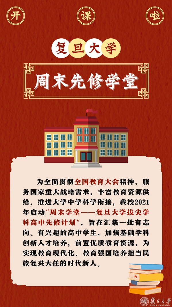 在三月中旬,复旦大学将开放周末先修学堂报名系统,各位高中生可关注复旦大学、复旦招生官方微信公众号,及时获悉报名的相关通知。